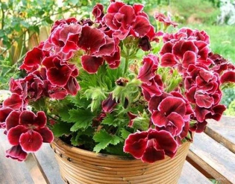 Королевская пеларгония покоряет своими крупными, яркими цветами. Листья у нее темные, шершавые.
